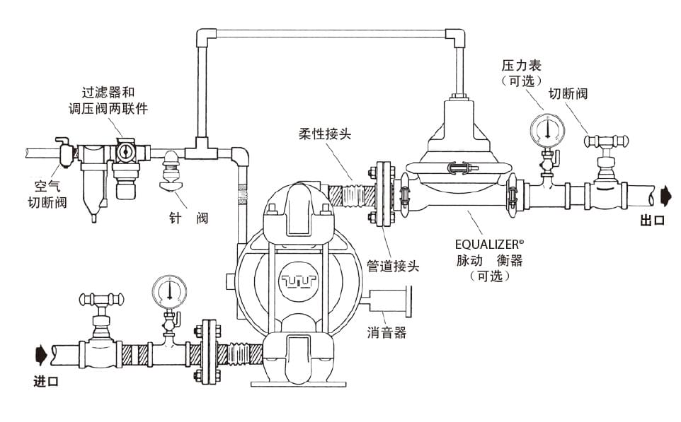 將泵安裝在平整臺面上,底腳固定,接上物料進(jìn)出管道(物料進(jìn)出口處的建議:安裝30-50CM長彈性軟管(或撓性接頭)以保護(hù)泵,降低、減少震動,避免螺栓松動,造成滲漏),緊固隔膜泵上所有螺絲(防止運輸搬動途中造成螺栓松動),接上氣源即可。